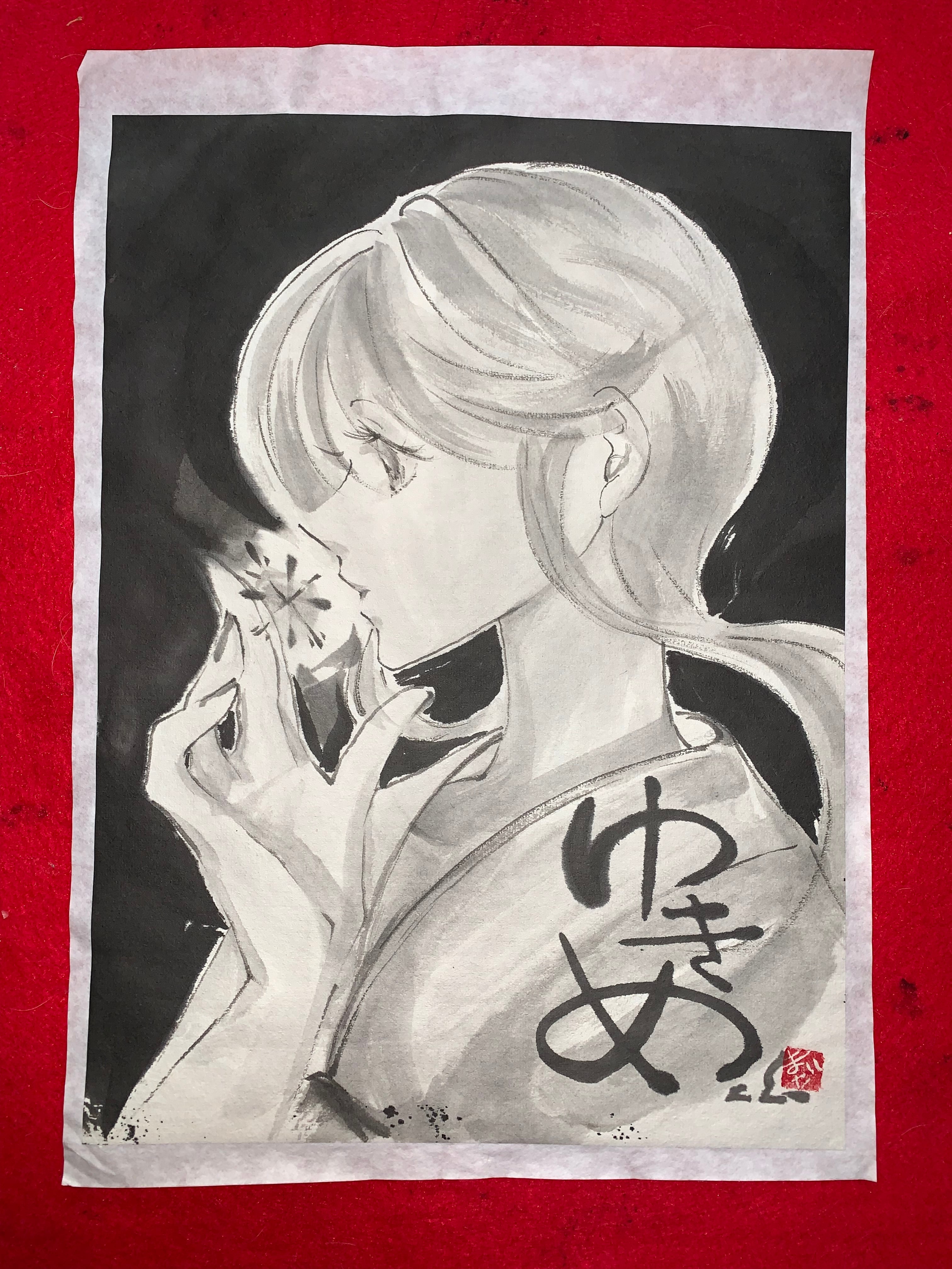 裏打ち済み。 B4額に飾っていただけます。 #美人画 #墨絵 #水墨画 二次創作物につき材料費のみでの贈答となります。