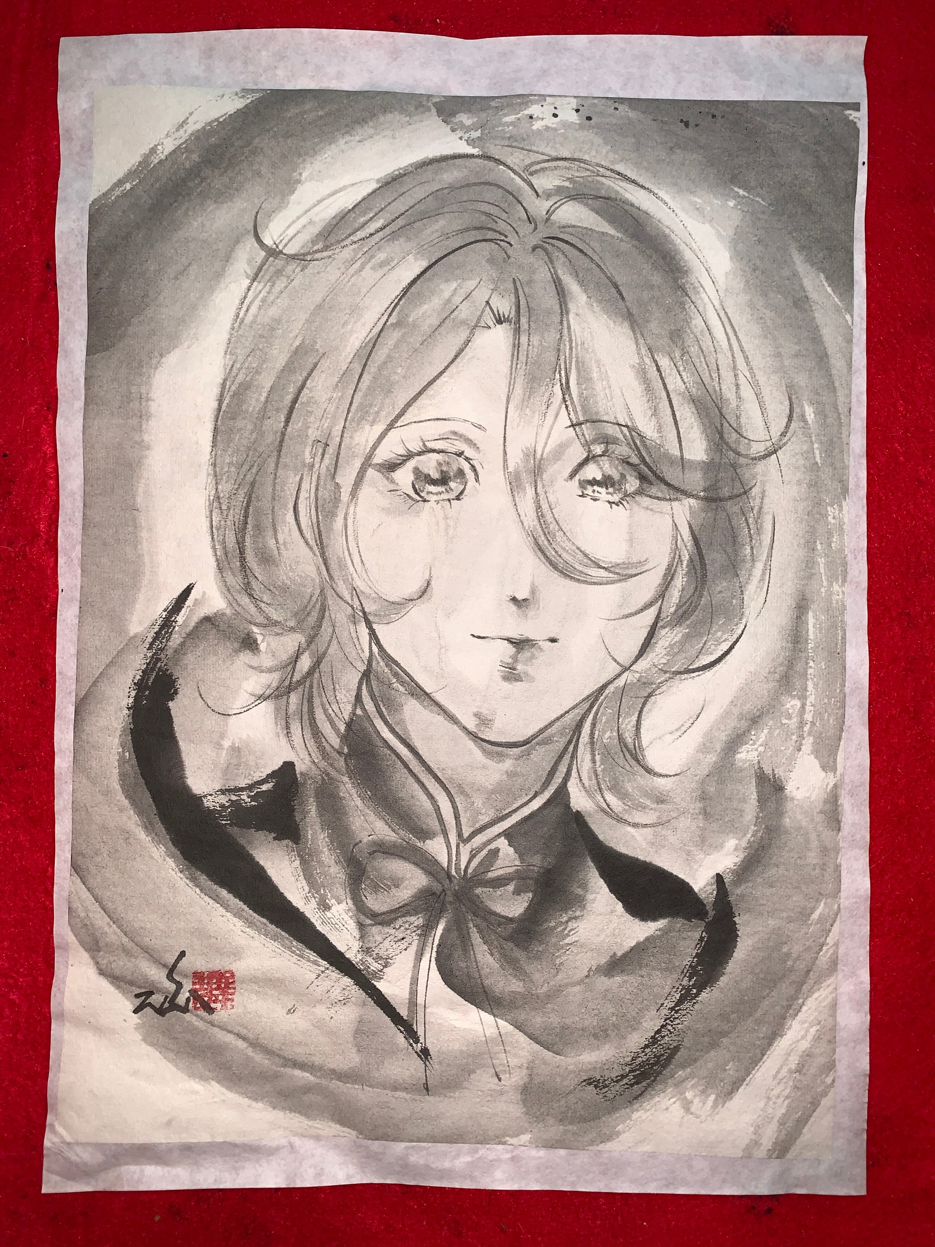裏打ち済み。 B4額に飾っていただけます。 #美人画 #墨絵 #水墨画 二次創作物につき材料費のみでの贈答となります。